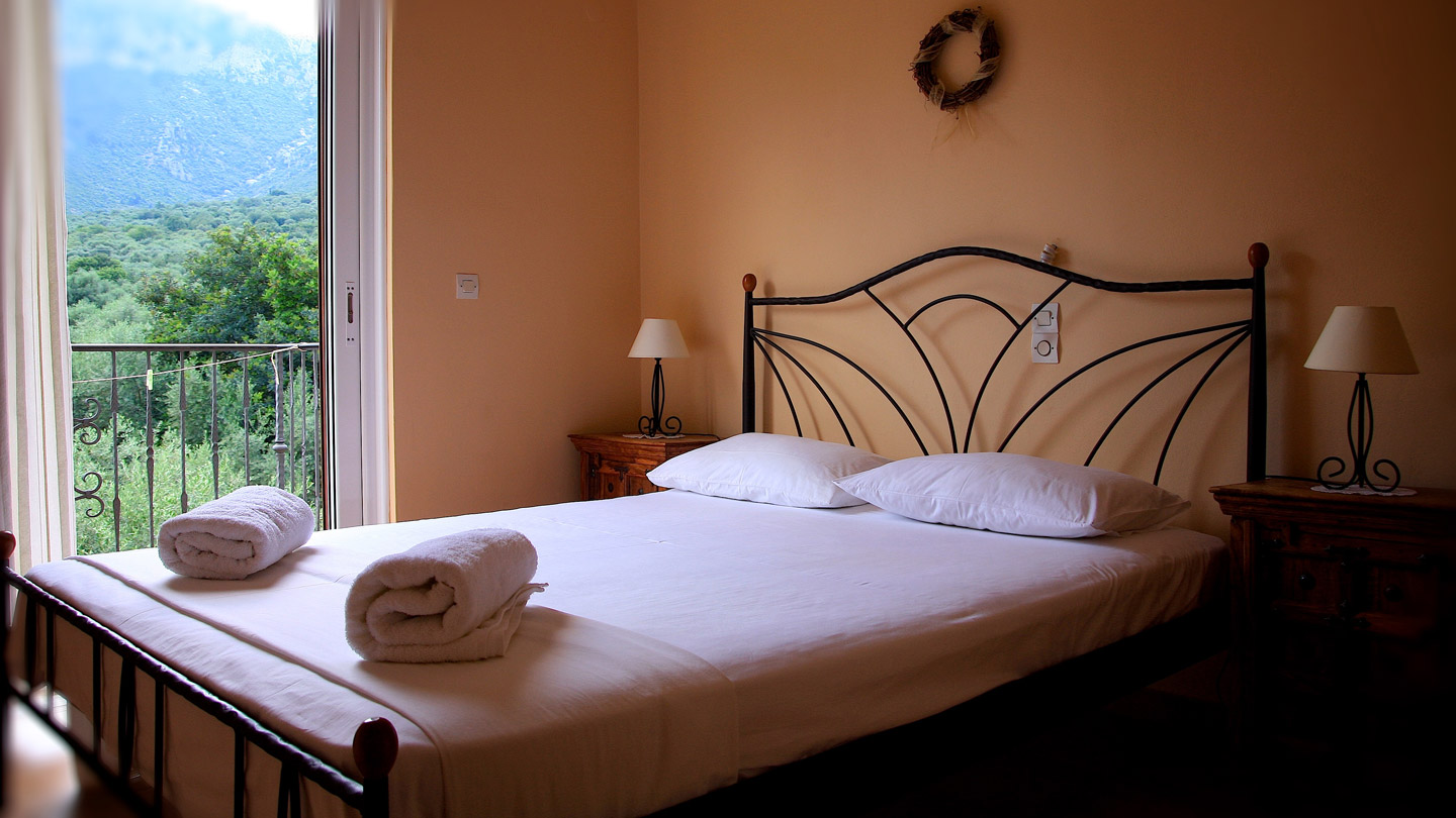 Two-room apartments that can accommodate 4 people. They consist of a bedroom, an open space in which is the kitchen and the living room with two stone beds - sofas and the bathroom. Each area has its own balcony with sea or mountain views.