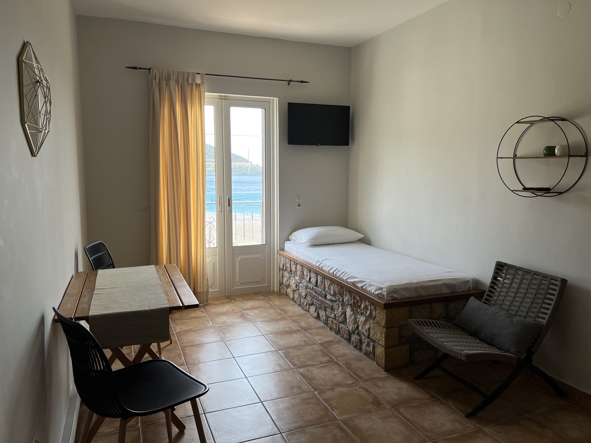 Two-room apartments that can accommodate 3 people. They consist of a bedroom, an open space in which is the kitchen and the living room with a stone bed - sofa and the bathroom. Each room has its own balcony overlooking the sea.